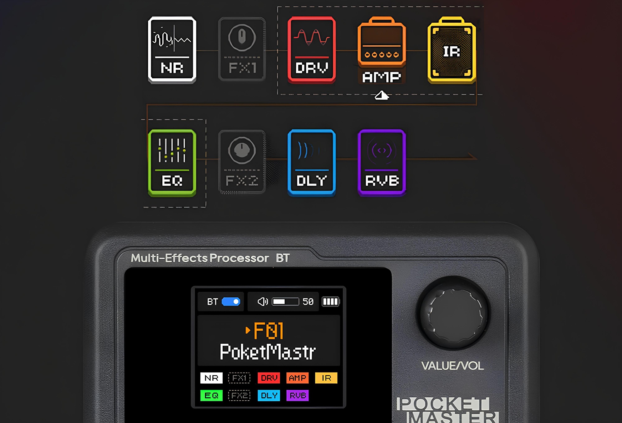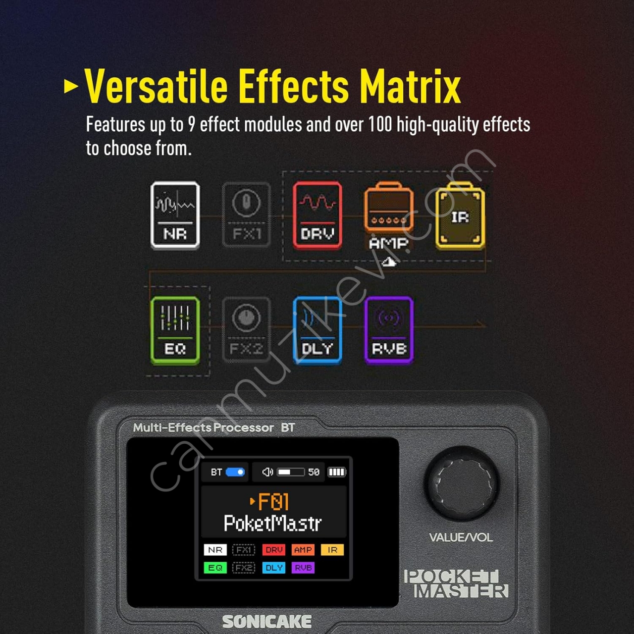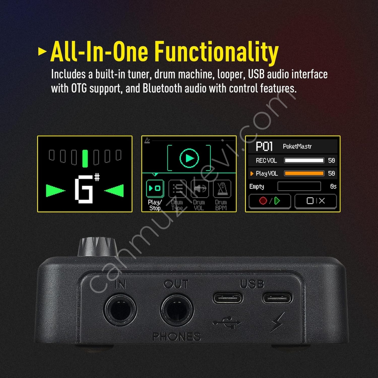 Pocket Master Black, kompakt yapısıyla kolay kullanım sağlar. Sahne ya da yolculukta bile kolaylıkla taşıyabileceğiniz bir efekt pedalıdır.Cihaz, overdrive’dan distortion’a, chorus’tan flanger’a, delay’dan reverb’e kadar geniş bir efekt yelpazesi sunar. Her biri kendi tonu ve karakteriyle gitar performansınızı zenginleştirir.Dahili kromatik akort cihazı sayesinde sahnede ya da prova sırasında hızlıca akor ayarı yapabilirsiniz. Gürültü olmadan net ve hassas akortlama imkânı sunar.